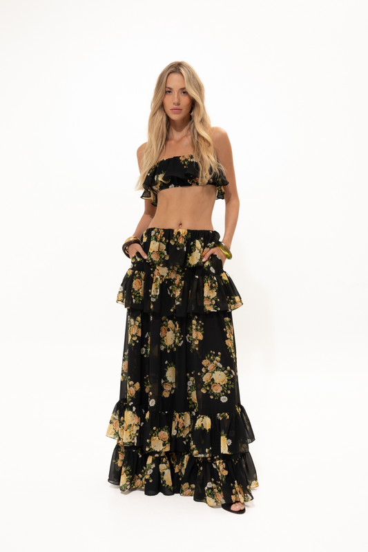 Sold outVK Black Floral Ruffled Skirt