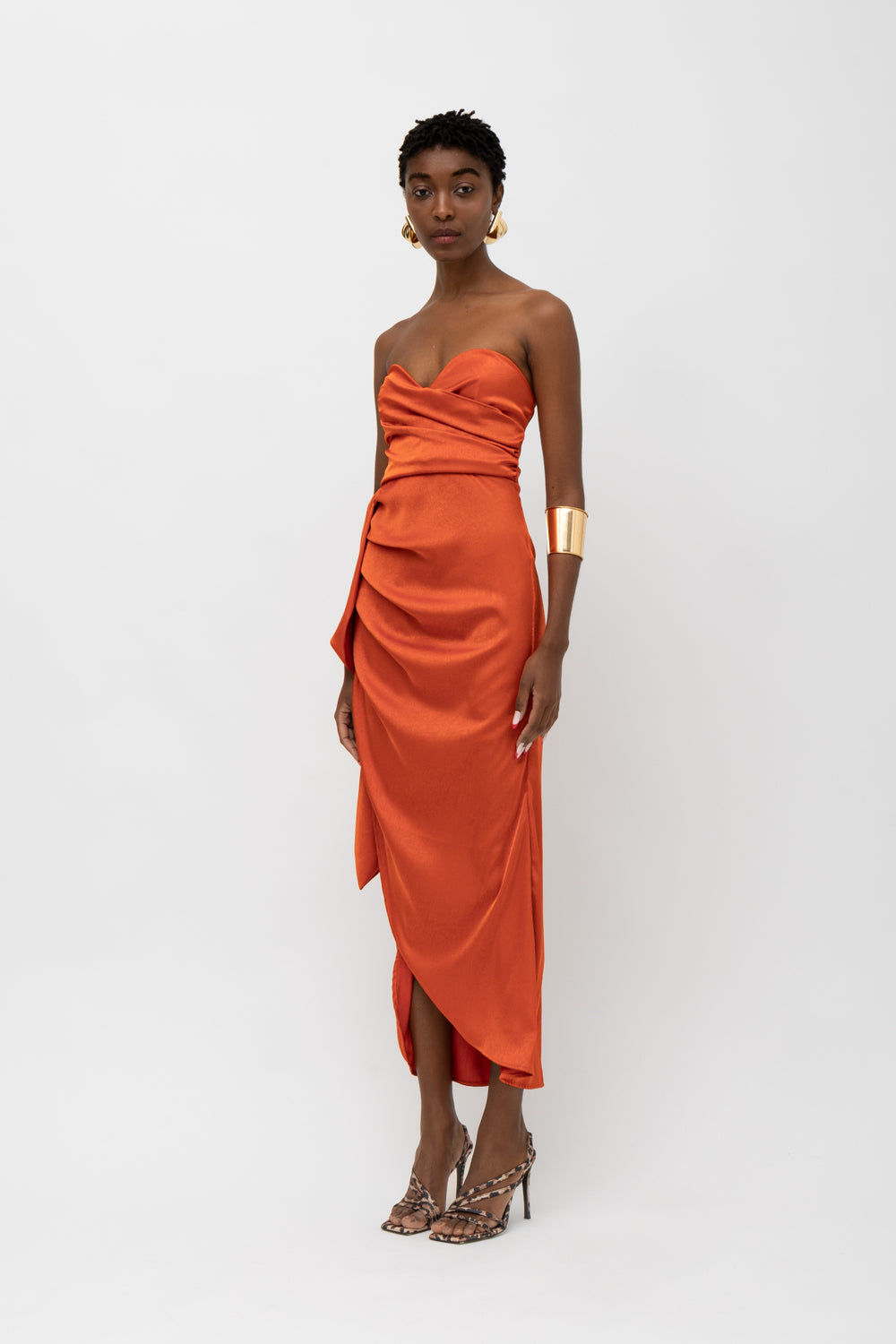 Make an elegant statement in this rust satin midi dress. Featuring a strapless sweetheart neckline and draped wrap detail, this silhouette flatters the figure with a touch of timeless elegance. Perfect for evening events, weddings, or special occasions.