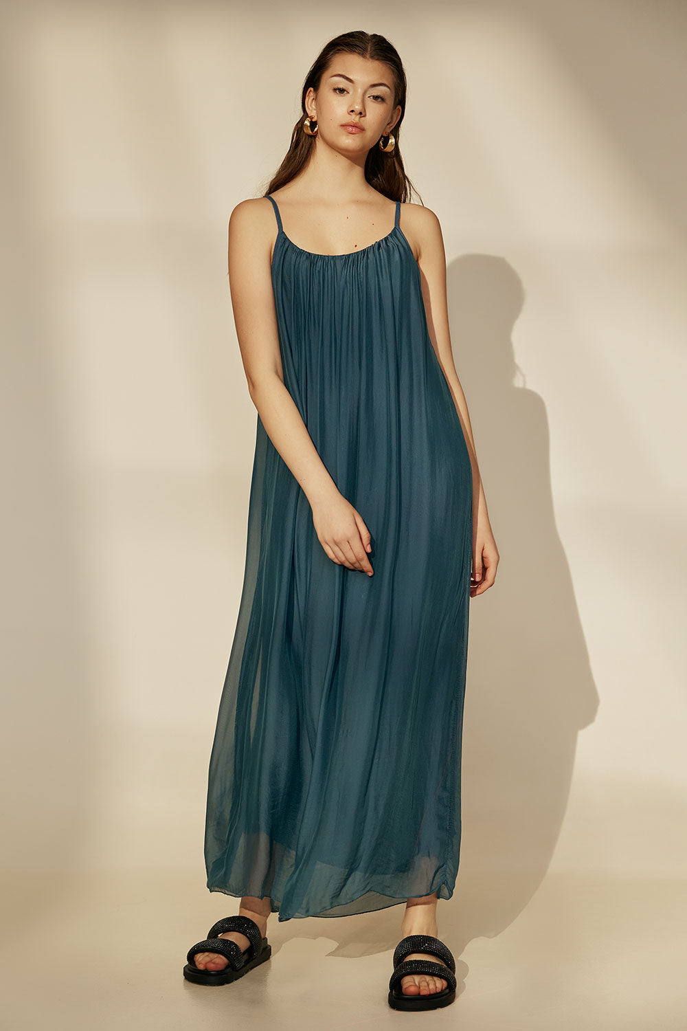 The Dione Dress is a soft and breezy mid-length dress with delicate straps that give it an elegant touch. Made from the finest silk and viscose, it’s a versatile piece perfect for special occasions or everyday wear.
