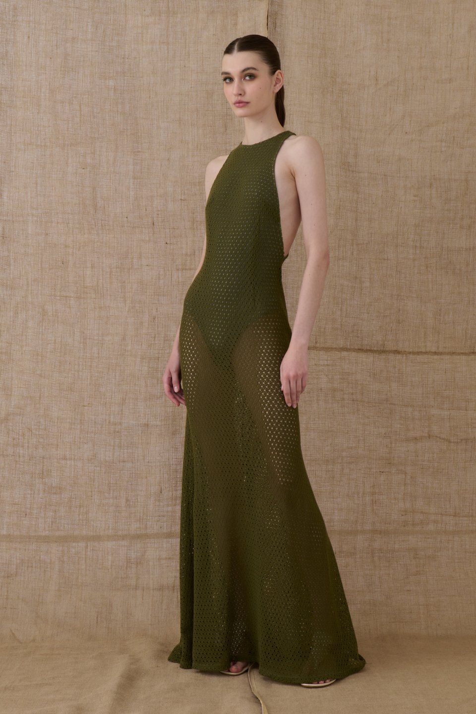 Khaki crocheted maxi dress with intricate detailing and a flattering, flowy silhouette. Perfect for styling with sandals or heels for a relaxed yet elegant look.